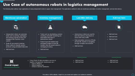 The following slide outlines major applications of using independent robots in supply chain management. The applications outlined in slide are warehouse automation, inventory management, and last-mile delivery. Presenting this PowerPoint presentation, titled Use Case Of Autonomous Robots Implementing Scale AI PPT Presentation AI SS V, with topics curated by our researchers after extensive research. This editable presentation is available for immediate download and provides attractive features when used. Download now and captivate your audience. Presenting this Use Case Of Autonomous Robots Implementing Scale AI PPT Presentation AI SS V. Our researchers have carefully researched and created these slides with all aspects taken into consideration. This is a completely customizable Use Case Of Autonomous Robots Implementing Scale AI PPT Presentation AI SS V that is available for immediate downloading. Download now and make an impact on your audience. Highlight the attractive features available with our PPTs.