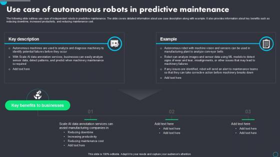 The following slide outlines use case of independent robots in predictive maintenance. The slide covers detailed information about use case description along with example. It also provides information about key benefits such as reducing downtime, increased productivity, and reducing maintenance cost. Here you can discover an assortment of the finest PowerPoint and Google Slides templates. With these templates, you can create presentations for a variety of purposes while simultaneously providing your audience with an eye-catching visual experience. Download Use Case Of Autonomous Robots In Implementing Scale AI PPT PowerPoint AI SS V to deliver an impeccable presentation. These templates will make your job of preparing presentations much quicker, yet still, maintain a high level of quality. Slidegeeks has experienced researchers who prepare these templates and write high-quality content for you. Later on, you can personalize the content by editing the Use Case Of Autonomous Robots In Implementing Scale AI PPT PowerPoint AI SS V.