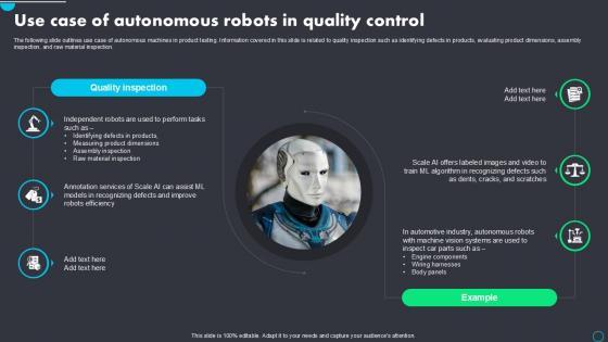 The following slide outlines use case of autonomous machines in product testing. Information covered in this slide is related to quality inspection such as identifying defects in products, evaluating product dimensions, assembly inspection, and raw material inspection. This Use Case Of Autonomous Robots In Quality Implementing Scale AI PPT Presentation AI SS V from Slidegeeks makes it easy to present information on your topic with precision. It provides customization options, so you can make changes to the colors, design, graphics, or any other component to create a unique layout. It is also available for immediate download, so you can begin using it right away. Slidegeeks has done good research to ensure that you have everything you need to make your presentation stand out. Make a name out there for a brilliant performance.