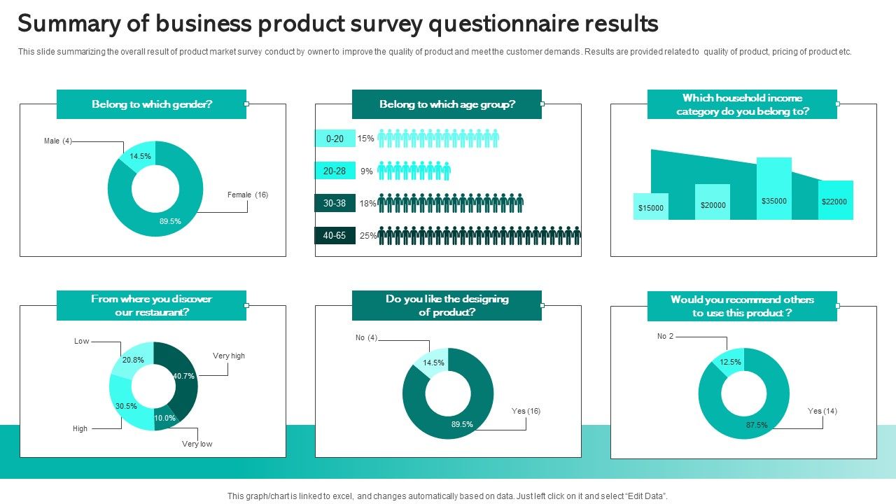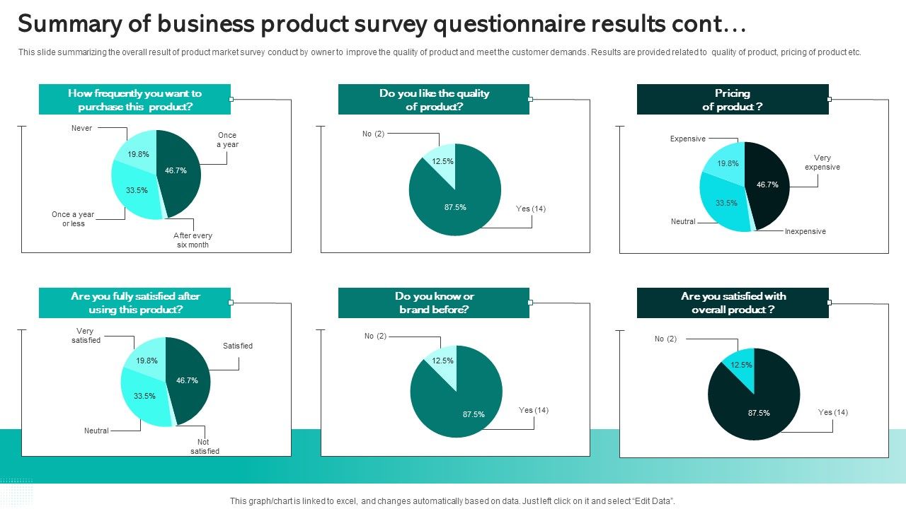 This slide summarizing the overall result of product market survey conduct by owner to improve the quality of product and meet the customer demands . Results are provided related to quality of product, pricing of product etc. Pitch your topic with ease and precision using this Summary Of Business Product Survey Questionnaire Results Survey SS. This layout presents information on Summary Of Business, Product Survey, Questionnaire Results. It is also available for immediate download and adjustment. So, changes can be made in the color, design, graphics or any other component to create a unique layout.