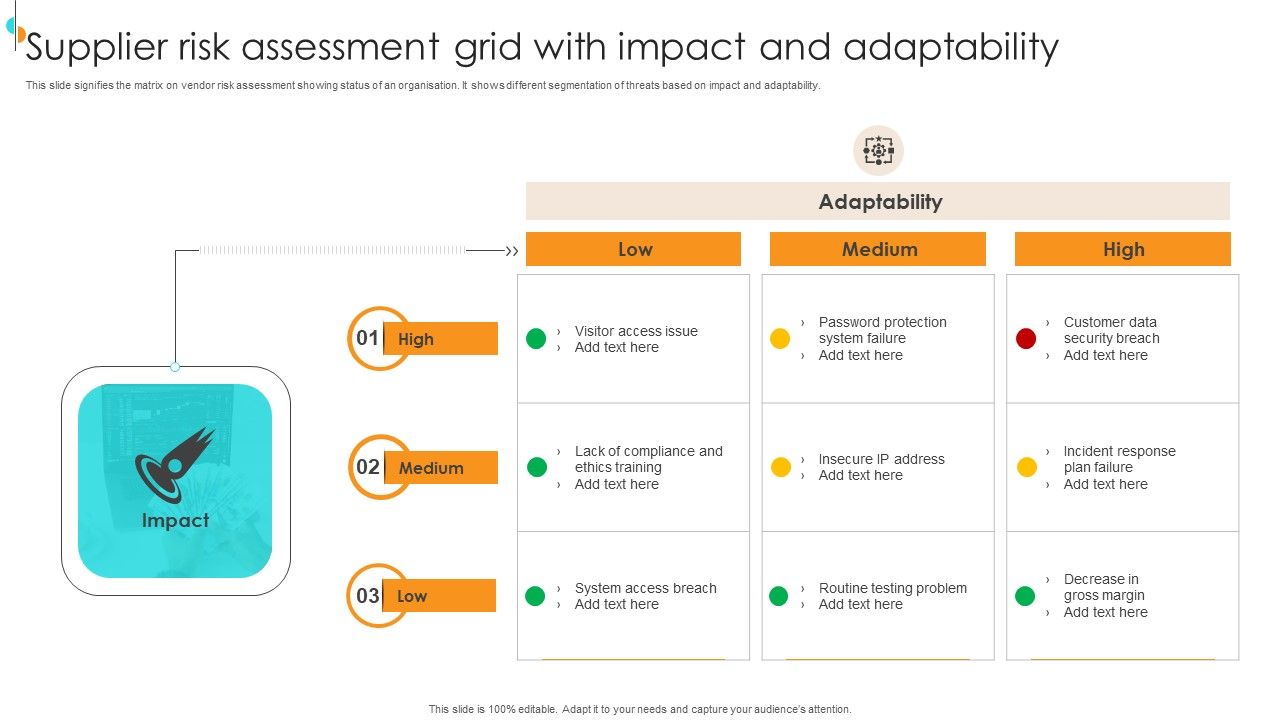 This slide signifies the matrix on vendor risk assessment showing status of an organisation. It shows different segmentation of threats based on impact and adaptability. Showcasing this set of slides titled Supplier Risk Assessment Grid With Impact And Adaptability Download PDF. The topics addressed in these templates are High, Medium, Impact. All the content presented in this PPT design is completely editable. Download it and make adjustments in color, background, font etc. as per your unique business setting.