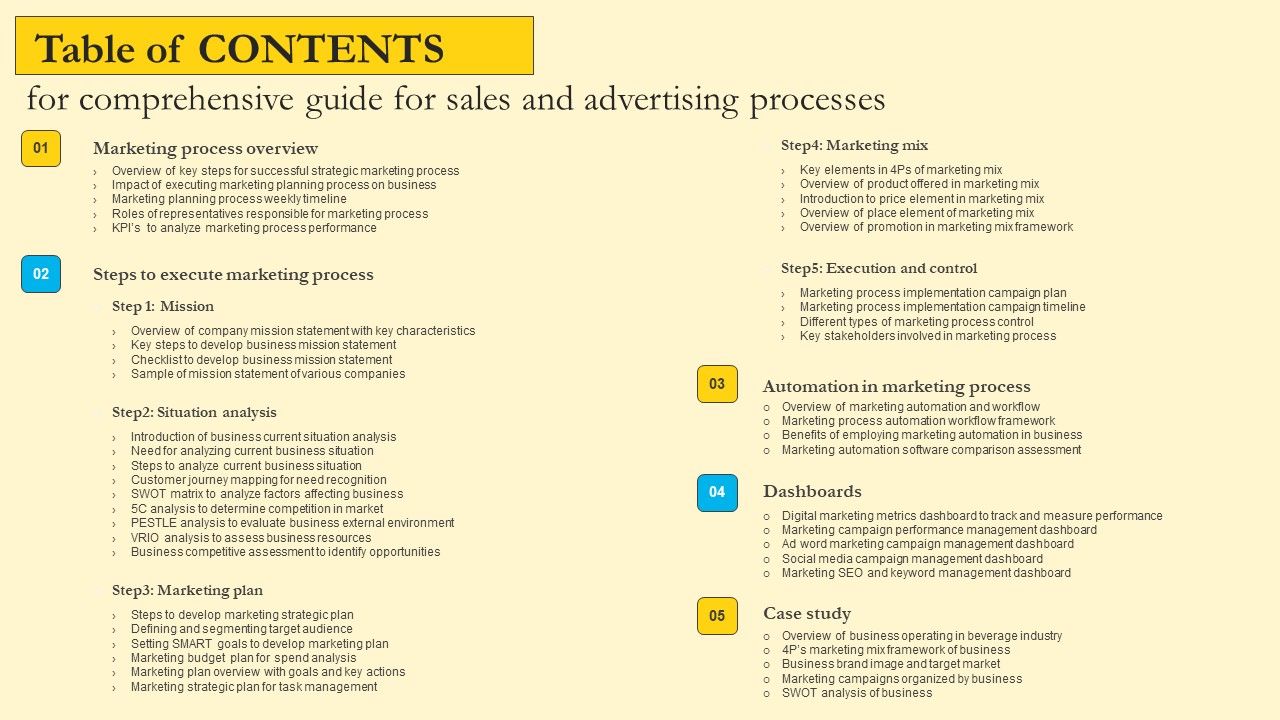 Table Of Contents For Comprehensive Guide For Sales And Advertising Processes Professional PDF with all 9 slides: