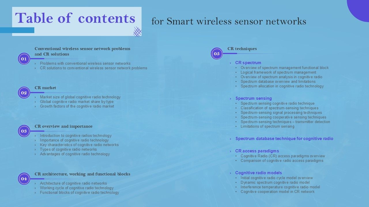 Boost your pitch with our creative Table Of Contents For Smart Wireless Sensor Networks Topics PDF. Deliver an awe-inspiring pitch that will mesmerize everyone. Using these presentation templates you will surely catch everyones attention. You can browse the ppts collection on our website. We have researchers who are experts at creating the right content for the templates. So you do not have to invest time in any additional work. Just grab the template now and use them.