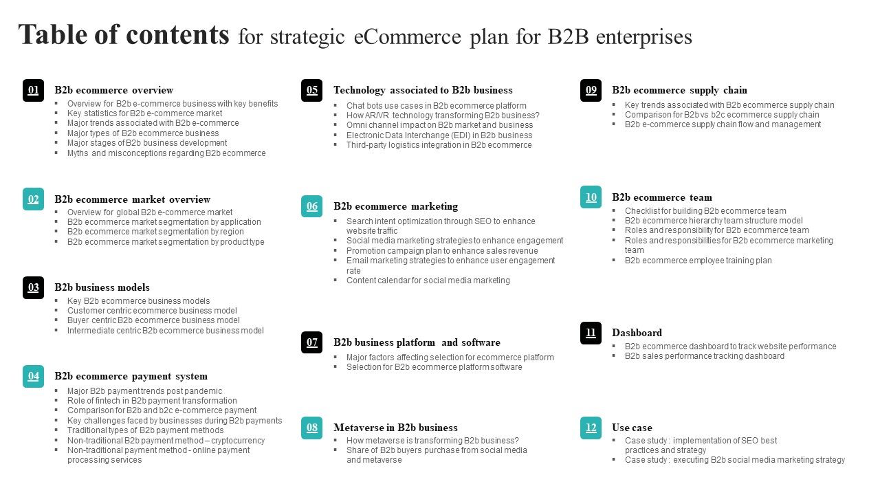 Find a pre-designed and impeccable Table Of Contents For Strategic Ecommerce Plan For B2B Enterprises Pictures PDF. The templates can ace your presentation without additional effort. You can download these easy-to-edit presentation templates to make your presentation stand out from others. So, what are you waiting for Download the template from Slidegeeks today and give a unique touch to your presentation.