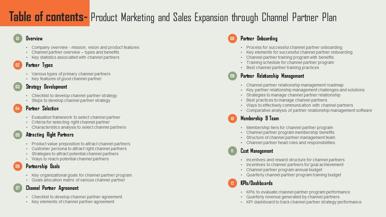 Table Of Contents Product Marketing And Sales Expansion Through Channel Partner Plan Information PDF