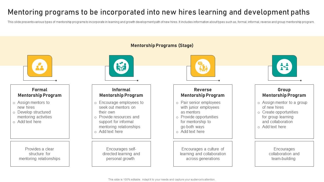 This slide presents various types of mentorship programs to incorporate in learning and growth development path of new hires. It includes information about types such as, formal, informal, reverse and group mentorship program. Coming up with a presentation necessitates that the majority of the effort goes into the content and the message you intend to convey. The visuals of a PowerPoint presentation can only be effective if it supplements and supports the story that is being told. Keeping this in mind our experts created Talent Retention Initiatives For New Hire Onboarding Mentoring Programs To Be Incorporated Topics PDF to reduce the time that goes into designing the presentation. This way, you can concentrate on the message while our designers take care of providing you with the right template for the situation.