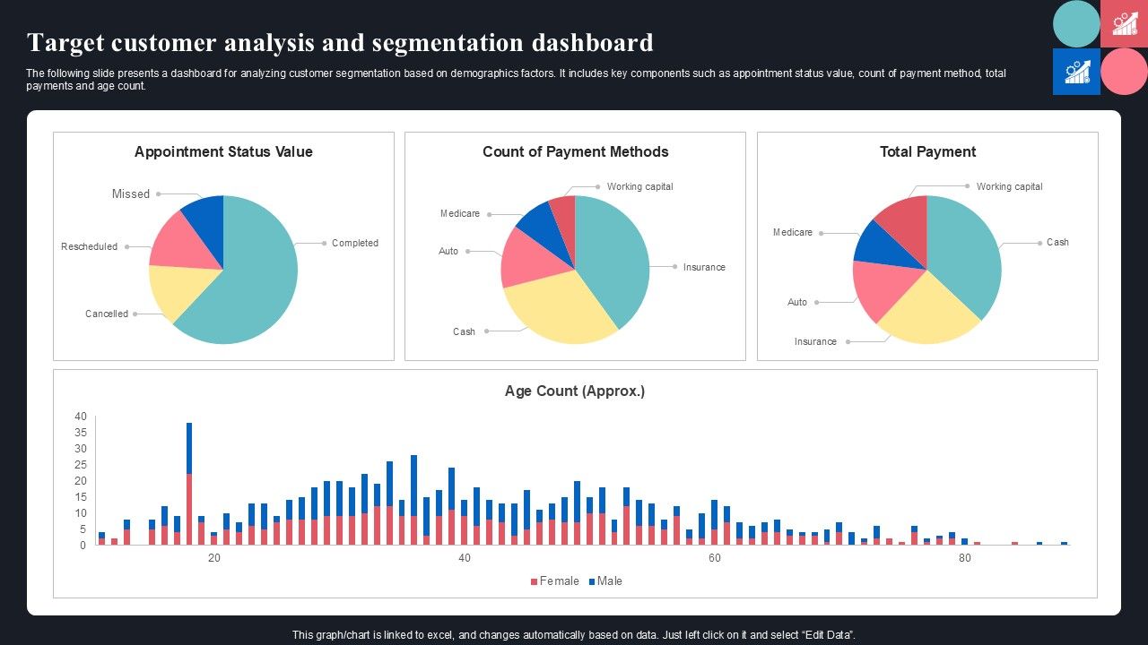 The following slide presents a dashboard for analyzing customer segmentation based on demographics factors. It includes key components such as appointment status value, count of payment method, total payments and age count. Slidegeeks is here to make your presentations a breeze with Target Customer Analysis And Segmentation Dashboard Ppt Portfolio Example Topics PDF With our easy to use and customizable templates, you can focus on delivering your ideas rather than worrying about formatting. With a variety of designs to choose from, you are sure to find one that suits your needs. And with animations and unique photos, illustrations, and fonts, you can make your presentation pop. So whether you are giving a sales pitch or presenting to the board, make sure to check out Slidegeeks first.