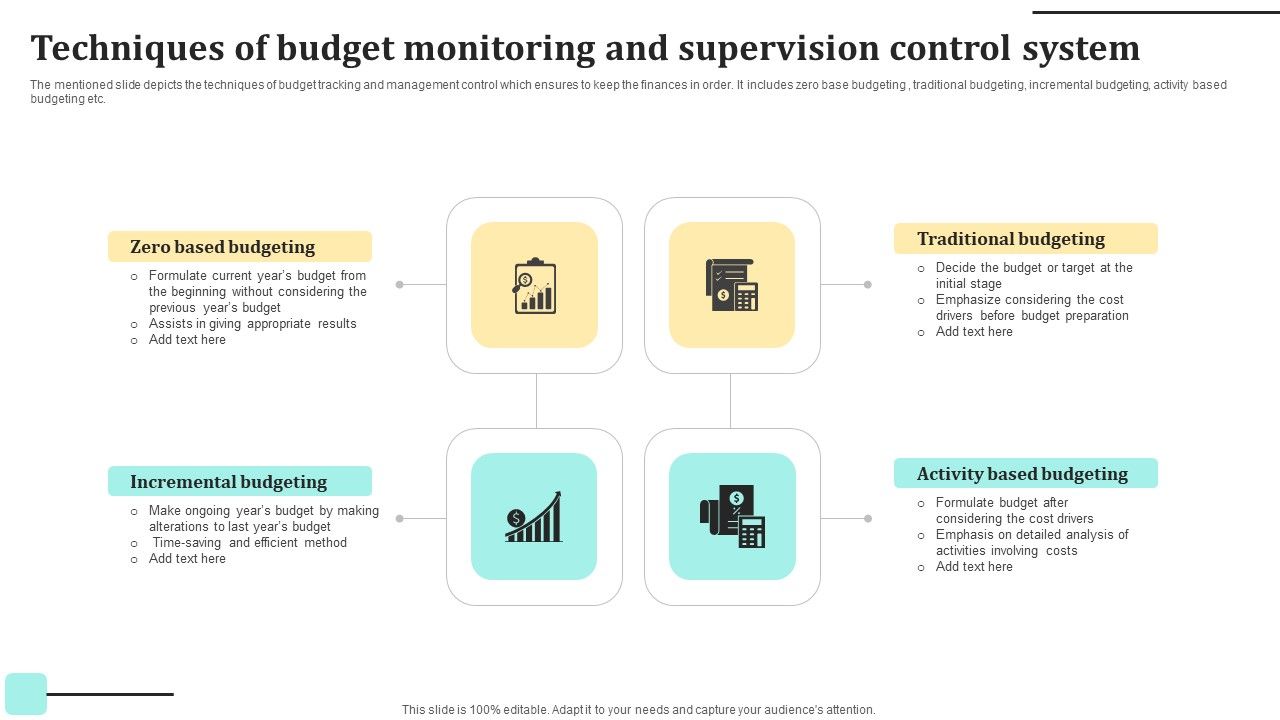 The mentioned slide depicts the techniques of budget tracking and management control which ensures to keep the finances in order. It includes zero base budgeting , traditional budgeting, incremental budgeting, activity based budgeting etc. Persuade your audience using this Techniques Of Budget Monitoring And Supervision Control System Slides PDF. This PPT design covers four stages, thus making it a great tool to use. It also caters to a variety of topics including Incremental Budgeting, Traditional Budgeting, Control System . Download this PPT design now to present a convincing pitch that not only emphasizes the topic but also showcases your presentation skills.