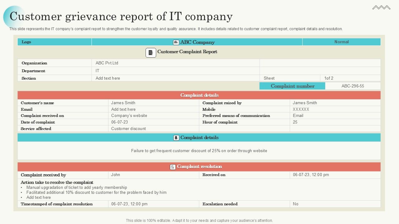 This slide represents the IT companys complaint report to strengthen the customer loyalty and quality assurance. It includes details related to customer complaint report, complaint details and resolution. Showcasing this set of slides titled Customer Grievance Report Of IT Company Diagrams PDF. The topics addressed in these templates are Customer Complaint Report, Complaint Resolution, Customer Grievance. All the content presented in this PPT design is completely editable. Download it and make adjustments in color, background, font etc. as per your unique business setting.