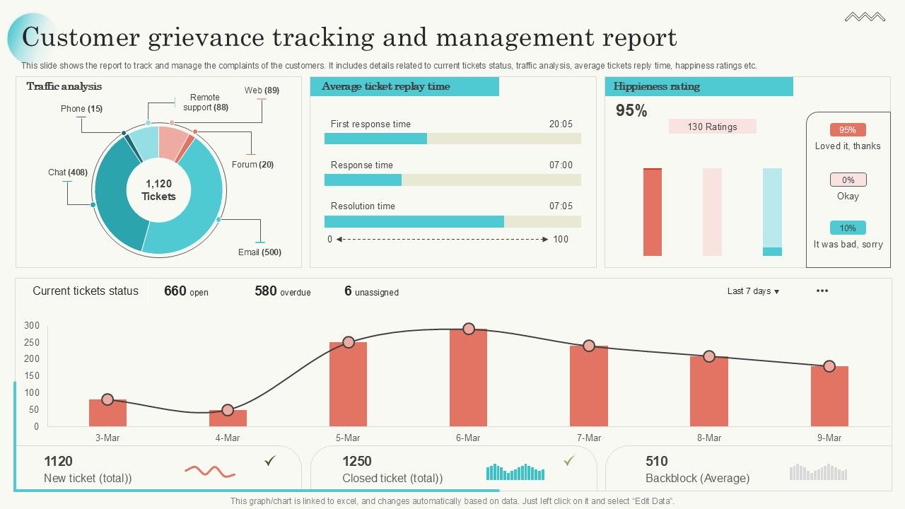 This slide shows the report to track and manage the complaints of the customers. It includes details related to current tickets status, traffic analysis, average tickets reply time, happiness ratings etc. Showcasing this set of slides titled Customer Grievance Tracking And Management Report Portrait PDF. The topics addressed in these templates are Traffic Analysis, Hippieness Rating, Average Ticket Replay. All the content presented in this PPT design is completely editable. Download it and make adjustments in color, background, font etc. as per your unique business setting.
