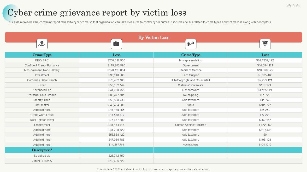 This slide represents the complaint report related to cyber crime so that organization can take measures to control cyber crimes. It includes details related to crime types and victims loss along with descriptors. Showcasing this set of slides titled Cyber Crime Grievance Report By Victim Loss Topics PDF. The topics addressed in these templates are Victim Loss, Cyber Crime, Grievance Report. All the content presented in this PPT design is completely editable. Download it and make adjustments in color, background, font etc. as per your unique business setting.