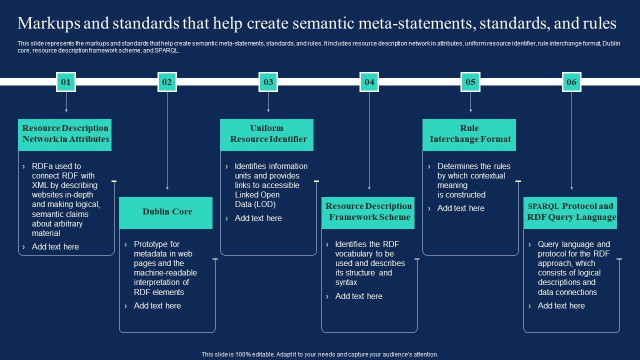 This slide represents the markups and standards that help create semantic meta statements, standards, and rules. It includes resource description network in attributes, uniform resource identifier, rule interchange format, Dublin core, resource description framework scheme, and SPARQL. Retrieve professionally designed Markups And Standards That Help Create Semantic Meta Statements Standards And Rules Elements PDF to effectively convey your message and captivate your listeners. Save time by selecting pre made slideshows that are appropriate for various topics, from business to educational purposes. These themes come in many different styles, from creative to corporate, and all of them are easily adjustable and can be edited quickly. Access them as PowerPoint templates or as Google Slides themes. You do not have to go on a hunt for the perfect presentation because Slidegeeks got you covered from everywhere.