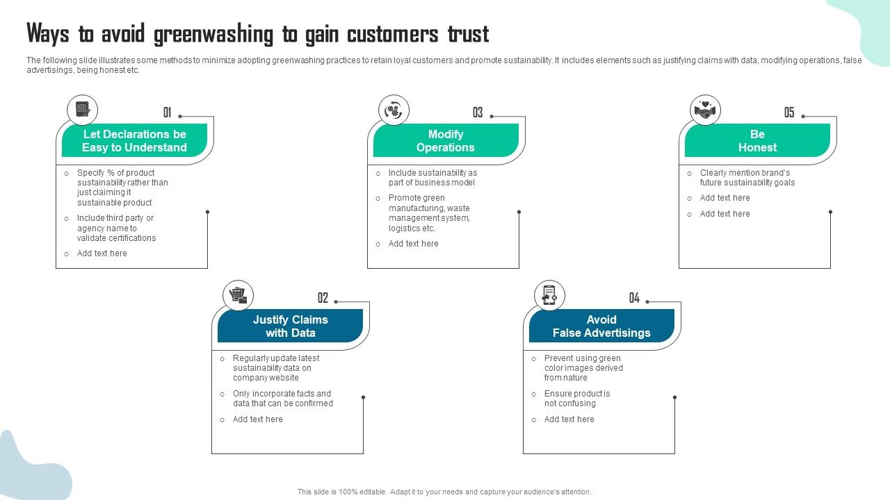 The following slide illustrates some methods to minimize adopting greenwashing practices to retain loyal customers and promote sustainability. It includes elements such as justifying claims with data, modifying operations, false advertisings, being honest etc. Retrieve professionally designed Ways To Avoid Greenwashing To Gain Customers Trust Download PDF to effectively convey your message and captivate your listeners. Save time by selecting pre made slideshows that are appropriate for various topics, from business to educational purposes. These themes come in many different styles, from creative to corporate, and all of them are easily adjustable and can be edited quickly. Access them as PowerPoint templates or as Google Slides themes. You do not have to go on a hunt for the perfect presentation because Slidegeeks got you covered from everywhere.