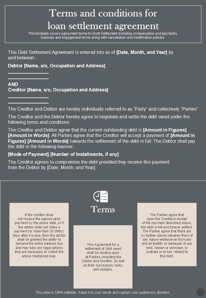 Terms And Conditions For Loan Settlement Agreement One Pager Sample Example Document