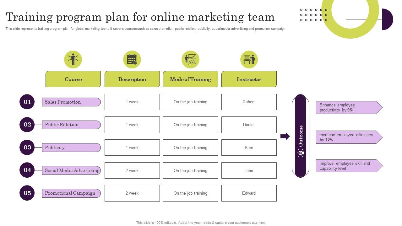 This slide represents training program plan for global marketing team. It covers courses such as sales promotion, public relation, publicity, social media advertising and promotion campaign. Find highly impressive Training Program Plan For Online Marketing Team Ppt Summary Designs Download PDF on Slidegeeks to deliver a meaningful presentation. You can save an ample amount of time using these presentation templates. No need to worry to prepare everything from scratch because Slidegeeks experts have already done a huge research and work for you. You need to download Training Program Plan For Online Marketing Team Ppt Summary Designs Download PDF for your upcoming presentation. All the presentation templates are 100 percent editable and you can change the color and personalize the content accordingly. Download now.
