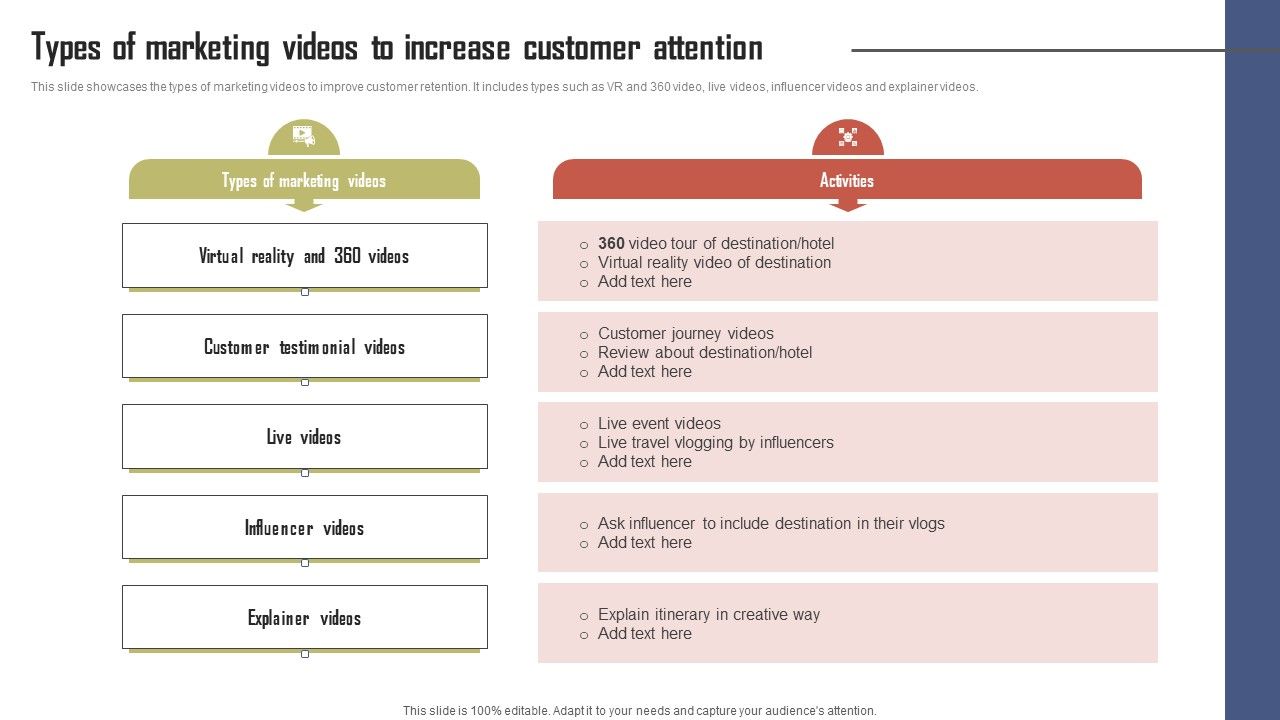This slide showcases the types of marketing videos to improve customer retention. It includes types such as VR and 360 video, live videos, influencer videos and explainer videos. Find highly impressive Types Of Marketing Videos To Increase Customer Effective Travel Marketing Guide For Improving Mockup PDF on Slidegeeks to deliver a meaningful presentation. You can save an ample amount of time using these presentation templates. No need to worry to prepare everything from scratch because Slidegeeks experts have already done a huge research and work for you. You need to download Types Of Marketing Videos To Increase Customer Effective Travel Marketing Guide For Improving Mockup PDF for your upcoming presentation. All the presentation templates are 100 percent editable and you can change the color and personalize the content accordingly. Download now