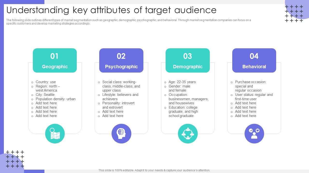 The following slide outlines different types of market segmentation such as geographic, demographic, psychographic, and behavioral. Through market segmentation companies can focus on a specific customers and develop marketing strategies accordingly. Find highly impressive Understanding Key Attributes Of Target Audience Ppt Gallery Styles PDF on Slidegeeks to deliver a meaningful presentation. You can save an ample amount of time using these presentation templates. No need to worry to prepare everything from scratch because Slidegeeks experts have already done a huge research and work for you. You need to download Understanding Key Attributes Of Target Audience Ppt Gallery Styles PDF for your upcoming presentation. All the presentation templates are 100 percent editable and you can change the color and personalize the content accordingly. Download now.