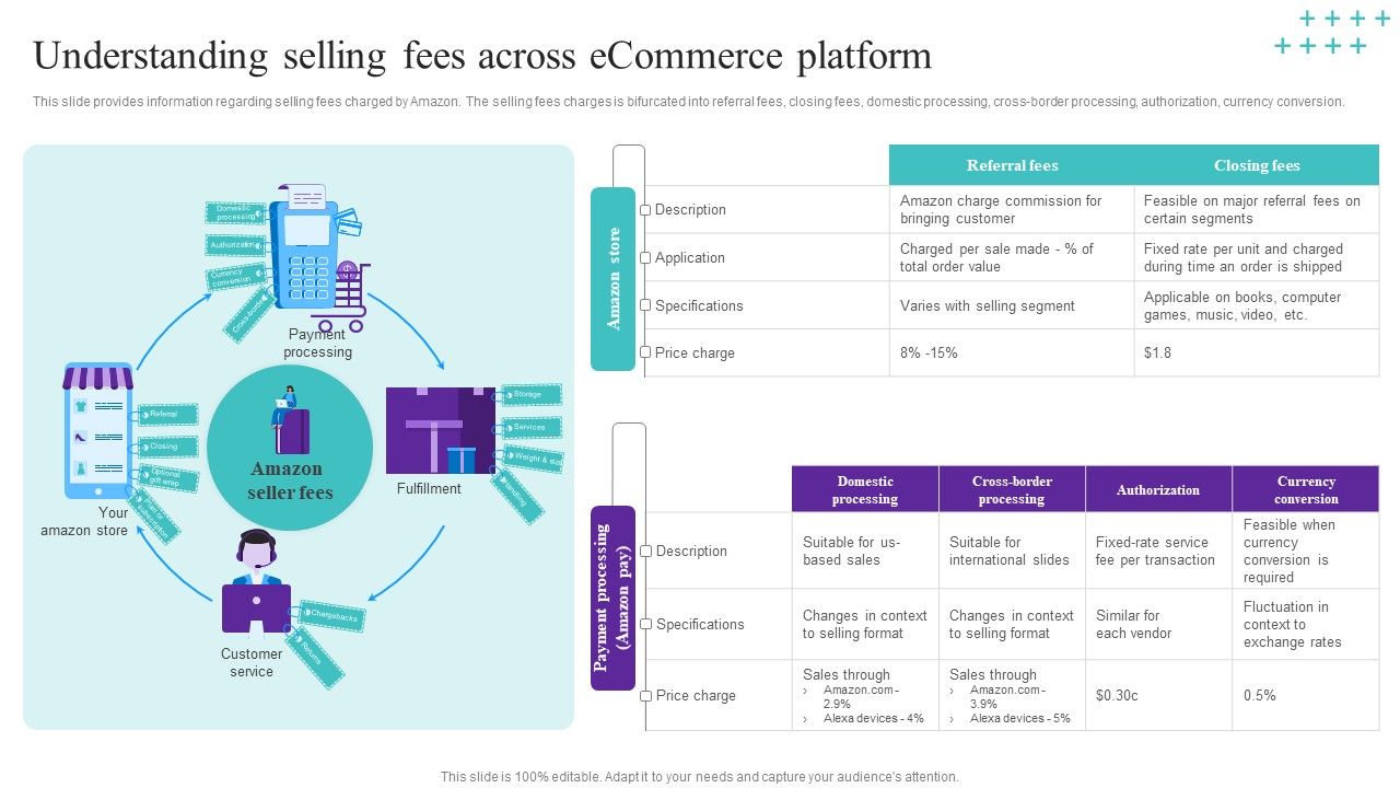 This slide provides information regarding selling fees charged by Amazon. The selling fees charges is bifurcated into referral fees, closing fees, domestic processing, cross-border processing, authorization, currency conversion. Are you in need of a template that can accommodate all of your creative concepts This one is crafted professionally and can be altered to fit any style. Use it with Google Slides or PowerPoint. Include striking photographs, symbols, depictions, and other visuals. Fill, move around, or remove text boxes as desired. Test out color palettes and font mixtures. Edit and save your work, or work with colleagues. Download Understanding Selling Fees Across Ecommerce Platform Information PDF and observe how to make your presentation outstanding. Give an impeccable presentation to your group and make your presentation unforgettable.