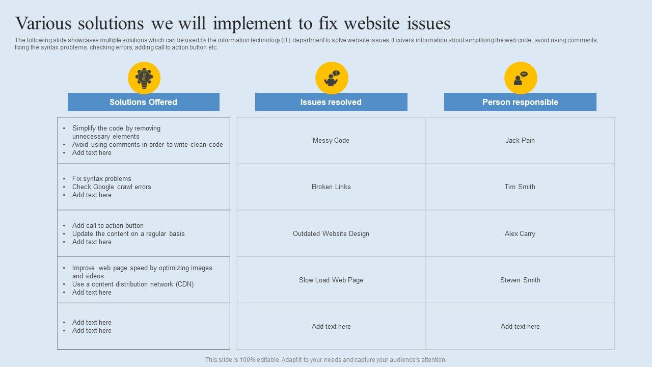 The following slide showcases multiple solutions which can be used by the information technology IT department to solve website issues. It covers information about simplifying the web code, avoid using comments, fixing the syntax problems, checking errors, adding call to action button etc. From laying roadmaps to briefing everything in detail, our templates are perfect for you. You can set the stage with your presentation slides. All you have to do is download these easy to edit and customizable templates. Various Solutions We Will Implement To Fix Website Issues Portrait PDF will help you deliver an outstanding performance that everyone would remember and praise you for. Do download this presentation today.