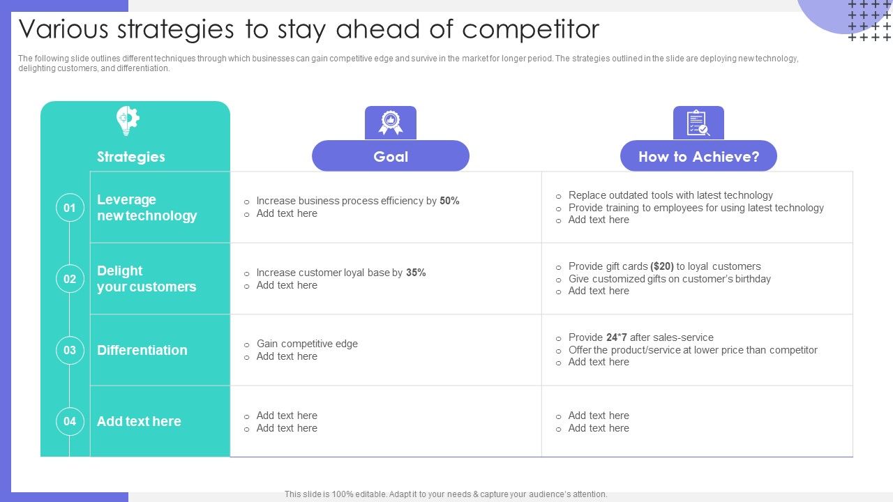 The following slide outlines different techniques through which businesses can gain competitive edge and survive in the market for longer period. The strategies outlined in the slide are deploying new technology, delighting customers, and differentiation. If your project calls for a presentation, then Slidegeeks is your go to partner because we have professionally designed, easy to edit templates that are perfect for any presentation. After downloading, you can easily edit Various Strategies To Stay Ahead Of Competitor Ppt Gallery Outfit PDF and make the changes accordingly. You can rearrange slides or fill them with different images. Check out all the handy templates.