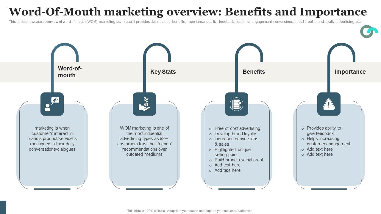 This slide showcases overview of word of mouth WOM marketing technique. It provides details about benefits, importance, positive feedback, customer engagement, conversions, social proof, brand loyalty, advertising, etc. Make sure to capture your audiences attention in your business displays with our gratis customizable Viral Marketing Techniques To Increase Annual Business Sales Word Of Mouth Marketing Overview Benefits Topics PDF. These are great for business strategies, office conferences, capital raising or task suggestions. If you desire to acquire more customers for your tech business and ensure they stay satisfied, create your own sales presentation with these plain slides.