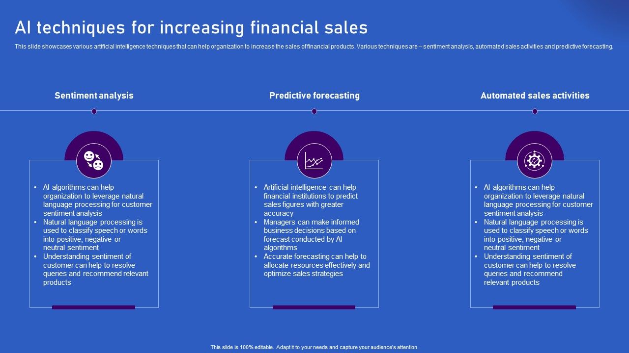 This slide showcases various artificial intelligence techniques that can help organization to increase the sales of financial products. Various techniques are sentiment analysis, automated sales activities and predictive forecasting. This modern and well arranged Ways Artificial Intelligence Is Transforming Finance Sector AI Techniques For Increasing Financial Sales Demonstration PDF provides lots of creative possibilities. It is very simple to customize and edit with the Powerpoint Software. Just drag and drop your pictures into the shapes. All facets of this template can be edited with Powerpoint no extra software is necessary. Add your own material, put your images in the places assigned for them, adjust the colors, and then you can show your slides to the world, with an animated slide included.