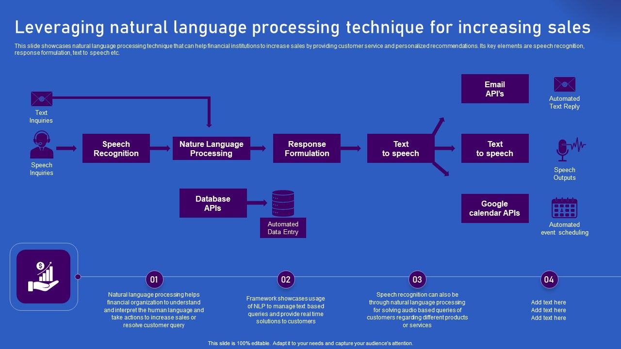This slide showcases natural language processing technique that can help financial institutions to increase sales by providing customer service and personalized recommendations. Its key elements are speech recognition, response formulation, text to speech etc. Do you have to make sure that everyone on your team knows about any specific topic I yes, then you should give Ways Artificial Intelligence Is Transforming Finance Sector Leveraging Natural Language Processing Topics PDF a try. Our experts have put a lot of knowledge and effort into creating this impeccable Ways Artificial Intelligence Is Transforming Finance Sector Leveraging Natural Language Processing Topics PDF. You can use this template for your upcoming presentations, as the slides are perfect to represent even the tiniest detail. You can download these templates from the Slidegeeks website and these are easy to edit. So grab these today.