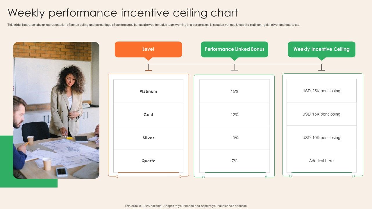 This slide illustrates tabular representation of bonus ceiling and percentage of performance bonus allowed for sales team working in a corporation. It includes various levels like platinum, gold, silver and quartz etc. Presenting Weekly Performance Incentive Ceiling Chart Demonstration PDF to dispense important information. This template comprises one stages. It also presents valuable insights into the topics including Level, Performance, Incentive Ceiling. This is a completely customizable PowerPoint theme that can be put to use immediately. So, download it and address the topic impactfully.