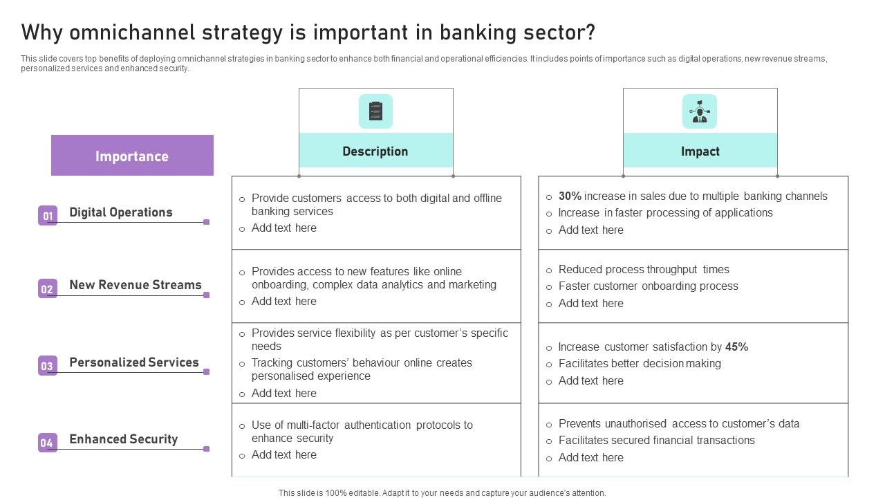 This slide covers top benefits of deploying omnichannel strategies in banking sector to enhance both financial and operational efficiencies. It includes points of importance such as digital operations, new revenue streams, personalized services and enhanced security. Explore a selection of the finest Why Omnichannel Strategy Is Important In Banking Sector Ppt Styles Topics PDF here. With a plethora of professionally designed and pre made slide templates, you can quickly and easily find the right one for your upcoming presentation. You can use our Why Omnichannel Strategy Is Important In Banking Sector Ppt Styles Topics PDF to effectively convey your message to a wider audience. Slidegeeks has done a lot of research before preparing these presentation templates. The content can be personalized and the slides are highly editable. Grab templates today from Slidegeeks.